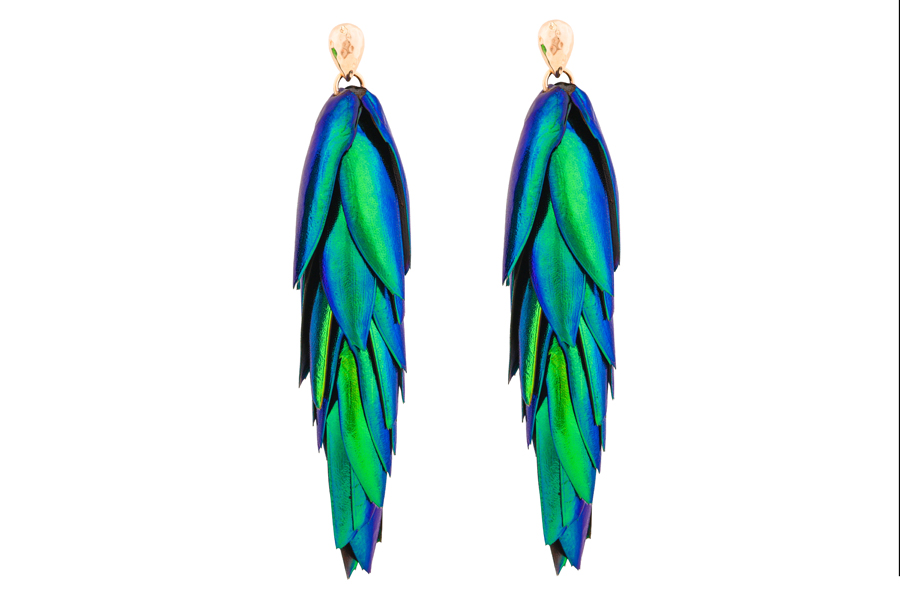 This design features around 30 recycled scarab wings per earring, which are individually processed and set to create this drop shape. They are extremely light and move gently with the wearer as they sit on the lobe.