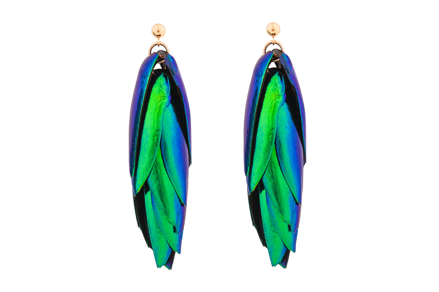This design features around 20 recycled scarab wings per earring, which are individually processed and set to create this drop shape. They are extremely light and move gently with the wearer as they sit on the lobe.