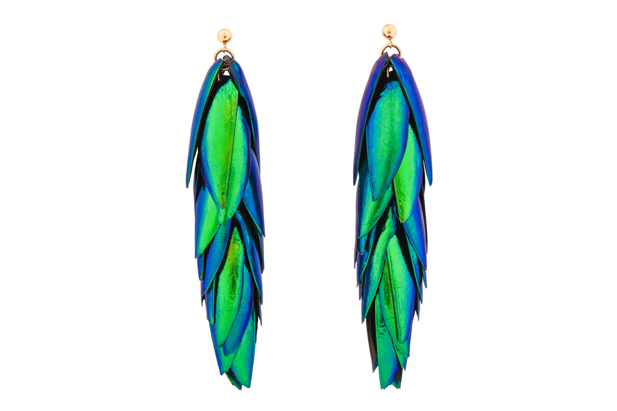 These beetle earrings feature around 30 recycled scarab wings per earring, which are individually processed and set to create this drop shape. They are extremely light and move gently with the wearer as they sit on the lobe.