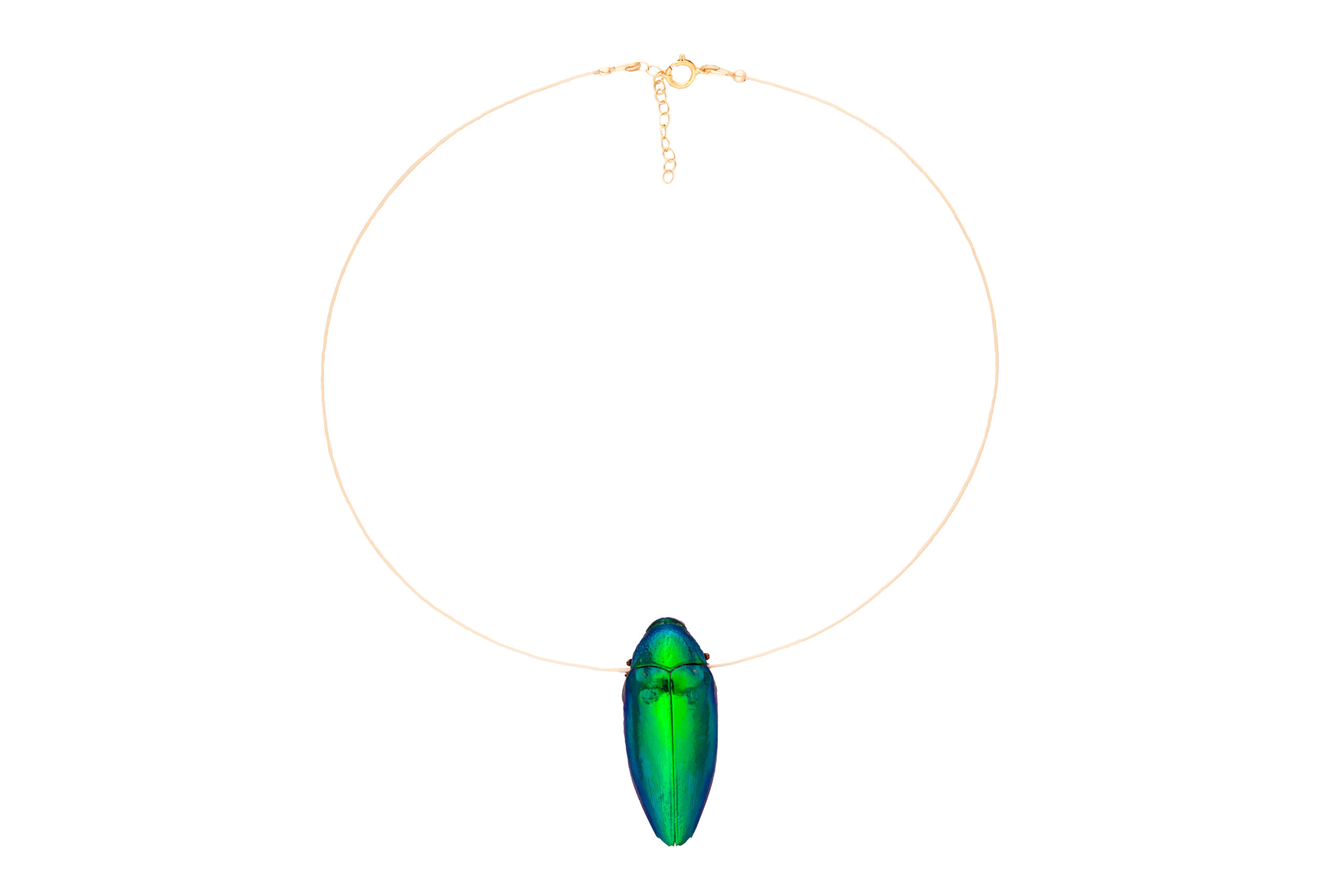 A recycled beetle pendant, filled with jewelry clay to preserve it’s natural beauty. For the necklace we use a 14K Gold-Filled wire covered in a silicone layer, which serves multiple purposes. Firstly, it helps maintain the choker’s rounded shape, preventing it from losing its form over time. Secondly, it protects the wearer’s skin from potential harm that may arise from direct contact with the wire. Lastly, but the most important feature is that the silicone layer enhances the visual appeal of the choker by creating a floating effect for the Scarab. 14K Gold Filled for the clasp and extension chain.