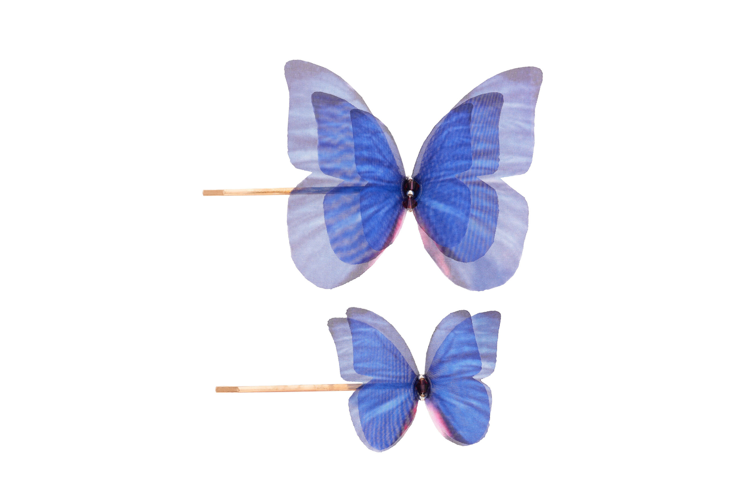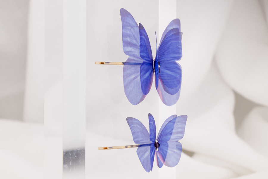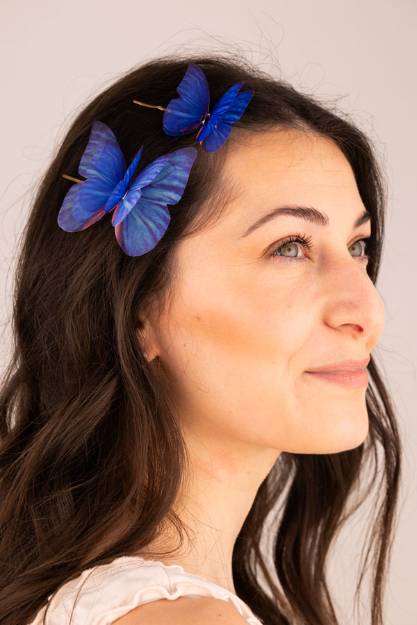 This special blue hair pin duo features two butterflies in a light blue shade, each handcrafted from pure silk for a delicate, lifelike effect. Set on secure gold-tone pins, they add a whimsical and ethereal accent to any hairstyle while remaining ultra-light, comfortable and very easy to style.