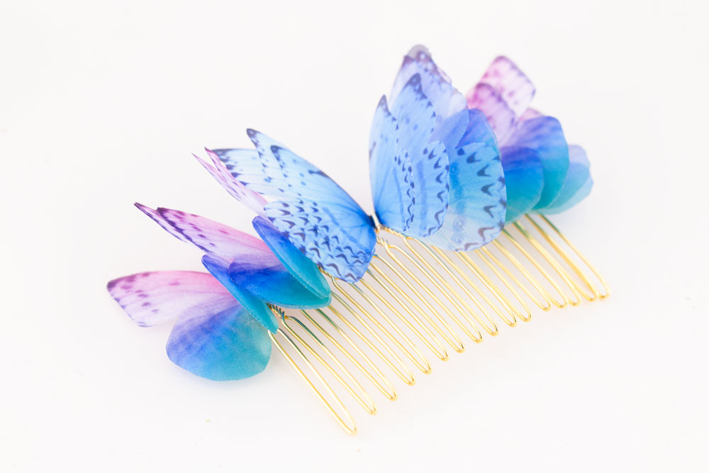 This hair comb accessory brings delicate silk butterflies to life in your hair, adding a touch of hopeless romance to your look. The butterflies wings are made from fine printed silk, each with subtle size variations, creating a volume that makes the wings flutter with every move.