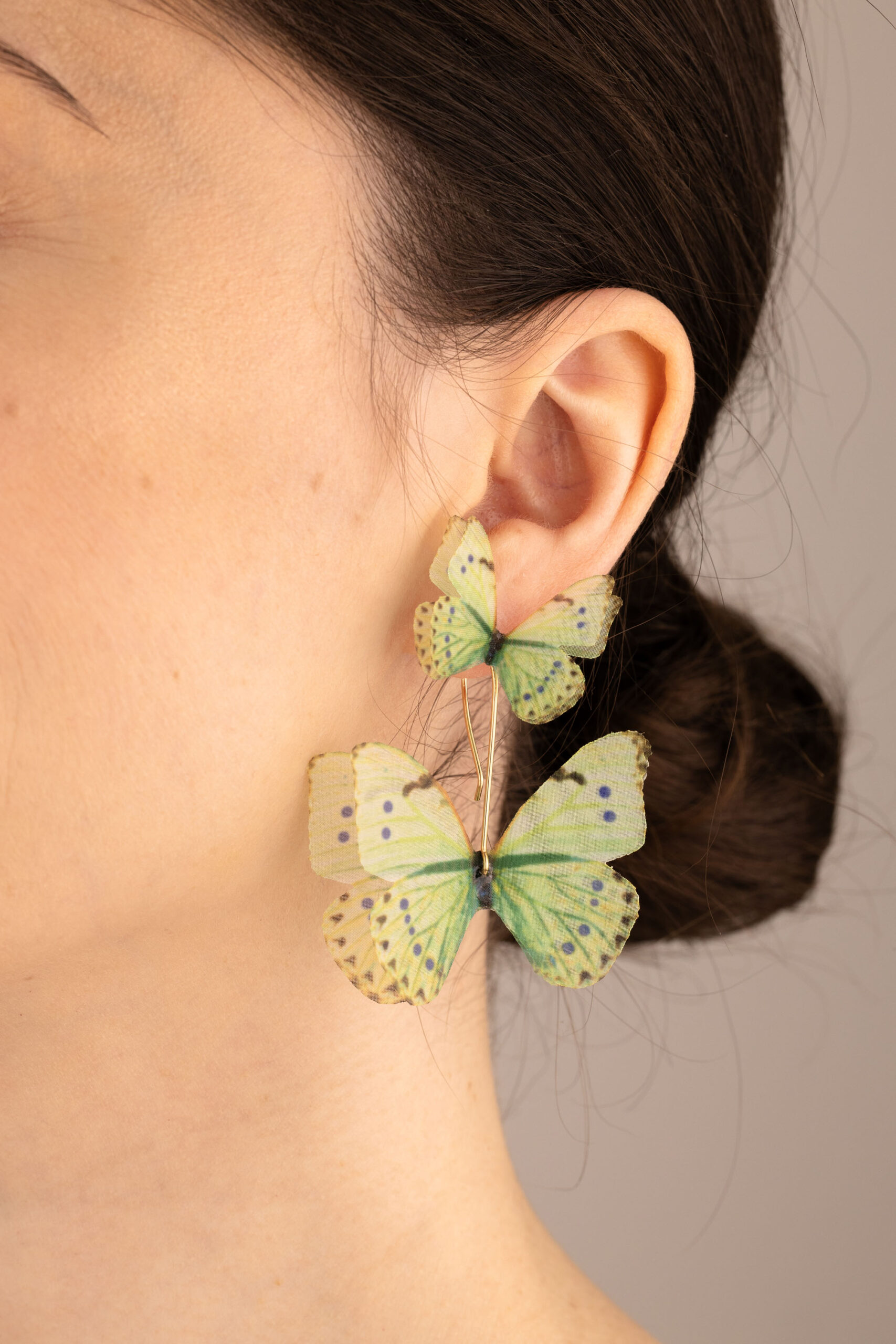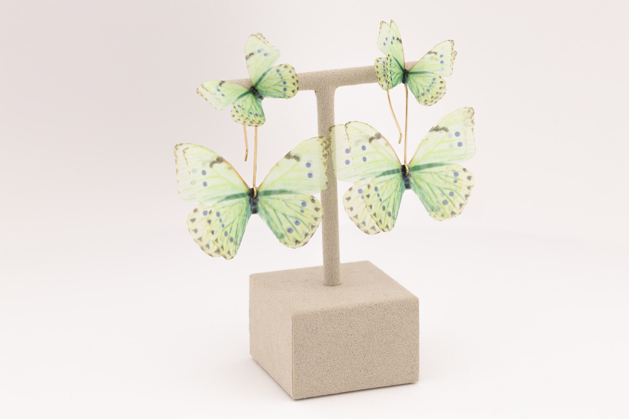 These handcrafted mint green earrings feature butterflies crafted from pure silk, set on elegant 14K gold-filled ear wires. The butterfly wings are very light and they shimmer with lifelike movement.