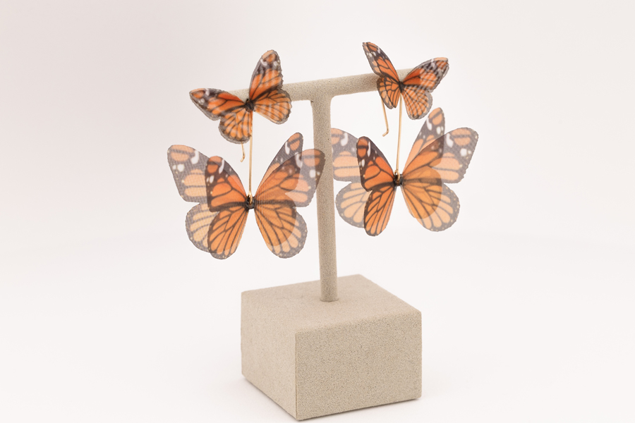 These handcrafted earrings feature monarch butterflies crafted from pure silk, set on elegant 14K gold-filled ear wires. The butterfly wings are very light and they shimmer with lifelike movement.