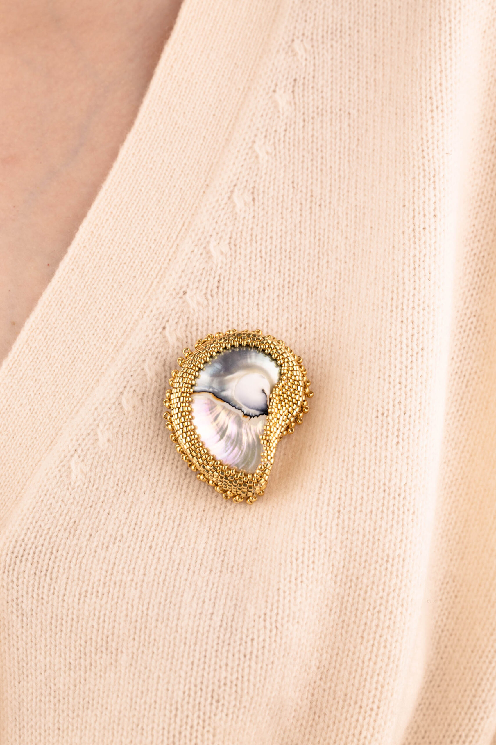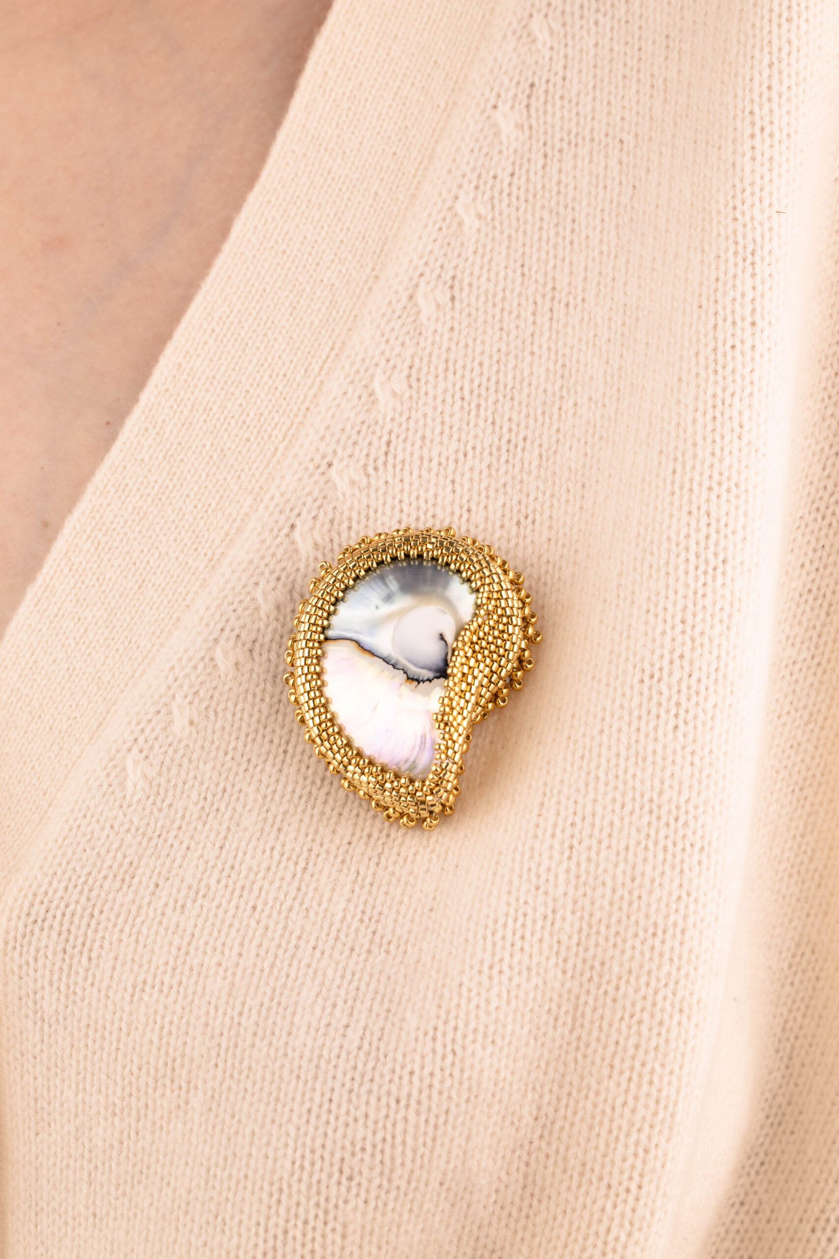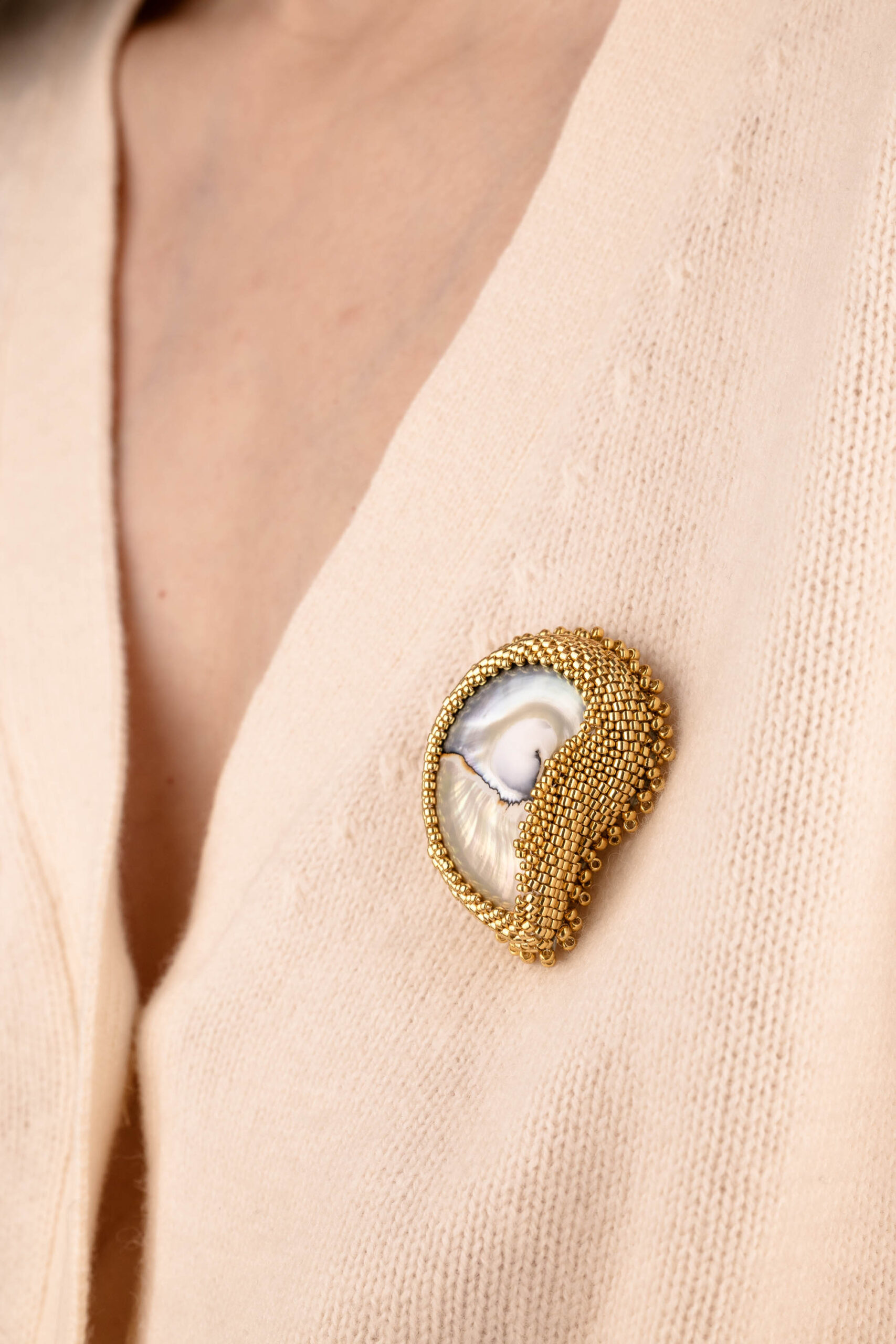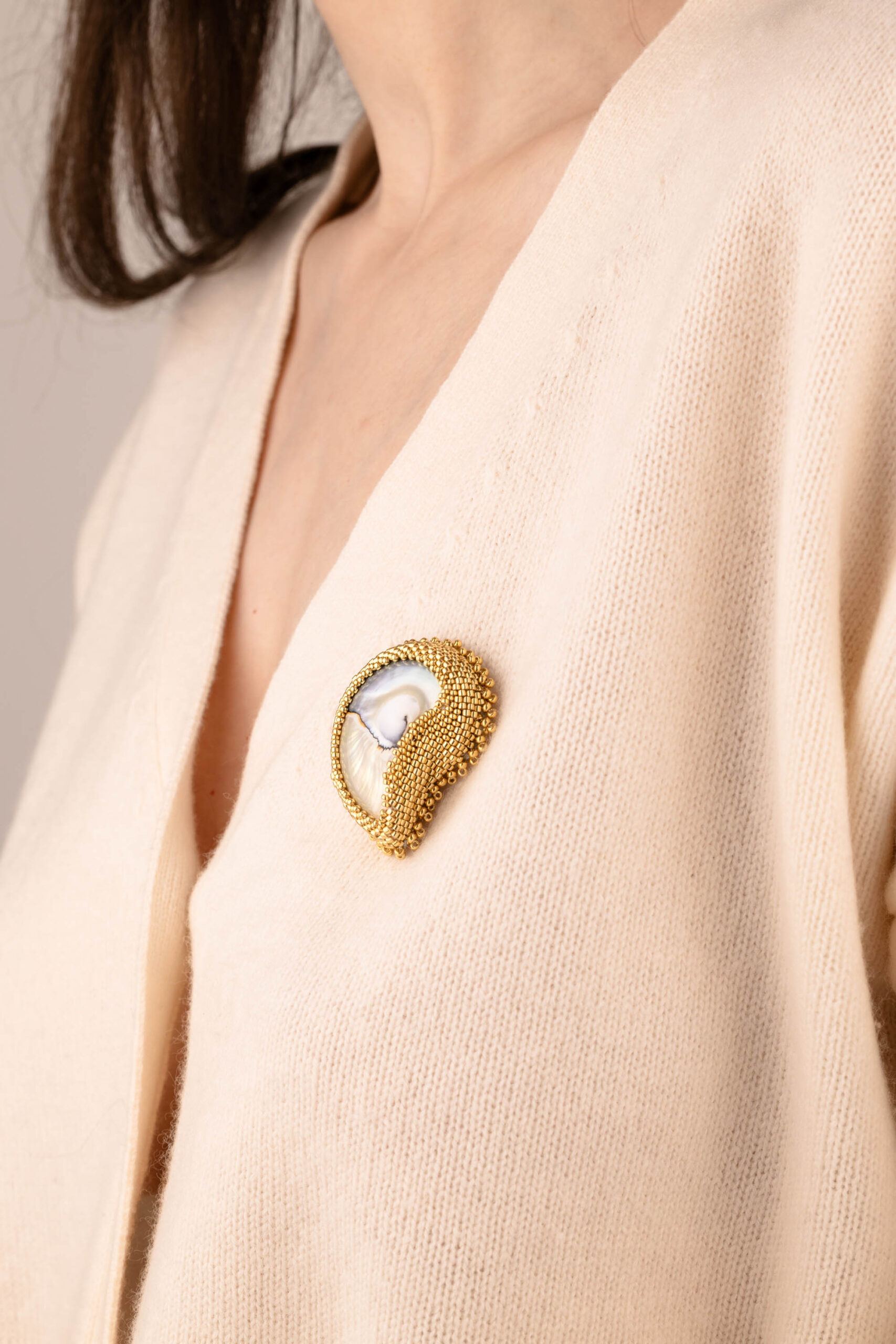 Transform any outfit with this statement Nautilus shell brooch, made from a real nautilus shell core, hand-stitched with high-quality gold glass beads to highlight its amazing pattern. The secure gold-plated sterling silver brooch pin ensures durability for coats, scarves, blazers and more. Perfect for collectors of unique shell jewelry, coastal couture, or heirloom-quality beaded jewelry.