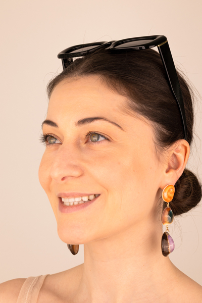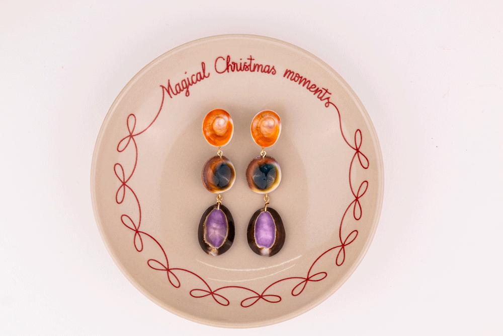 The top shell mirrors the organic curve of the human ear, grounding the design in the body itself. Beneath it, an eye-shaped shell watches softly, followed by a final shell that reveals a hidden violet hue, unveiled through a meticulous, hours-long process.