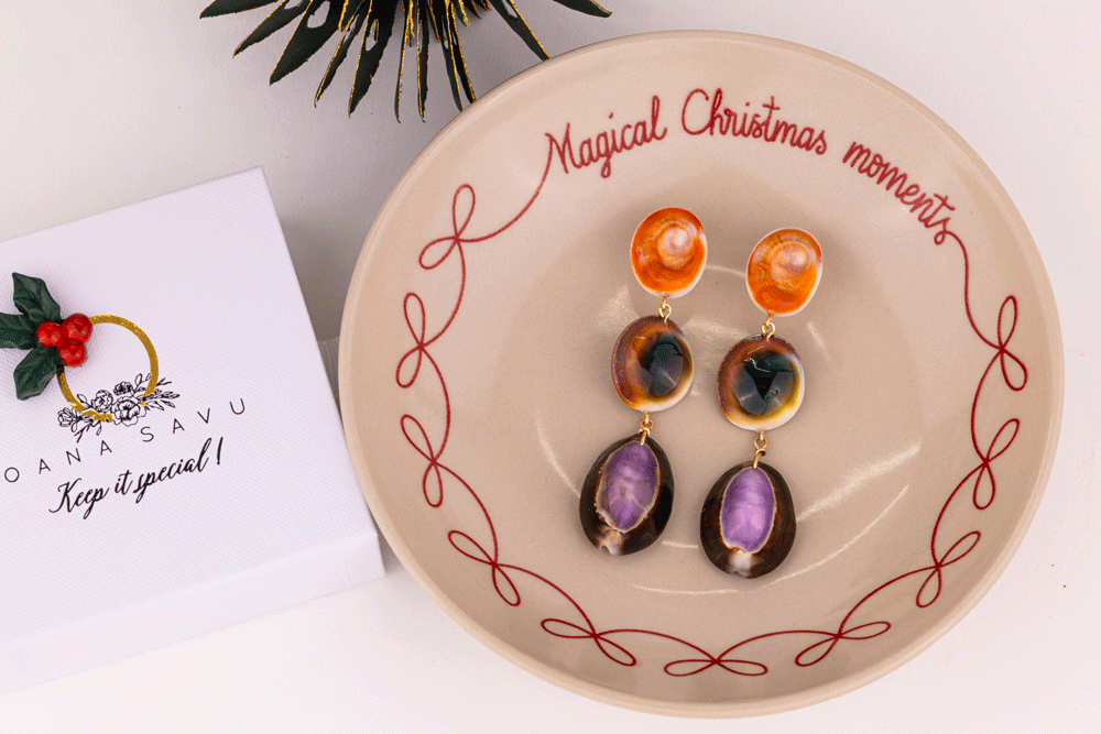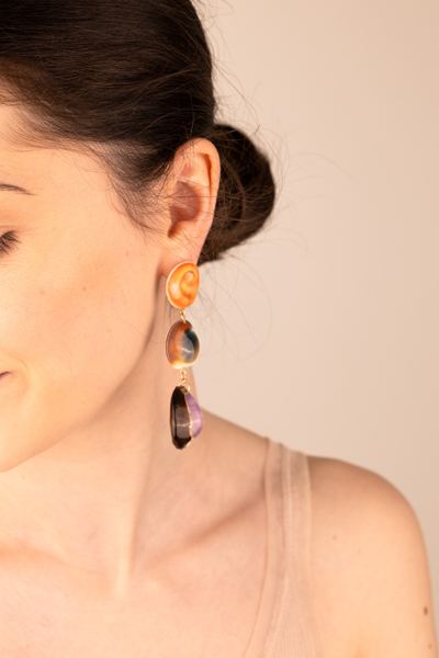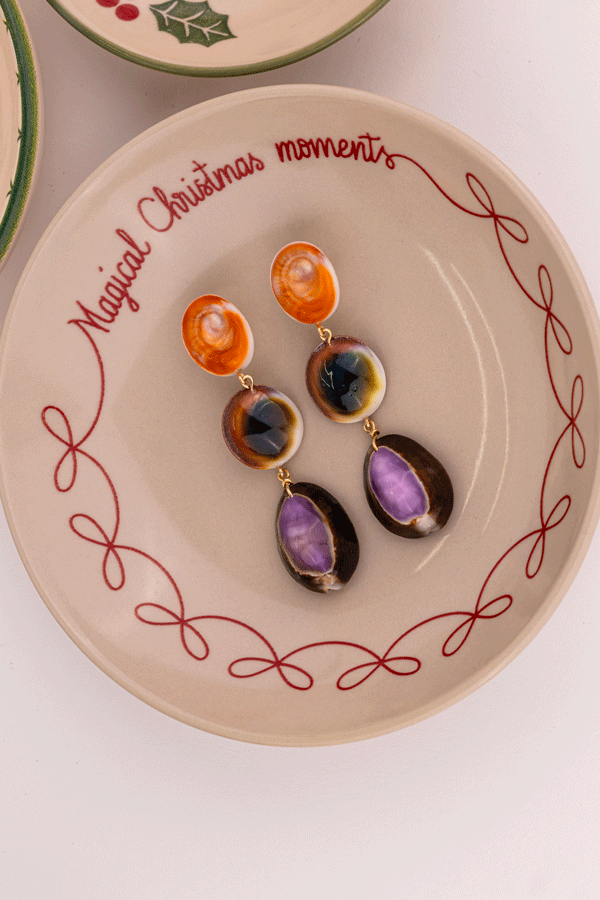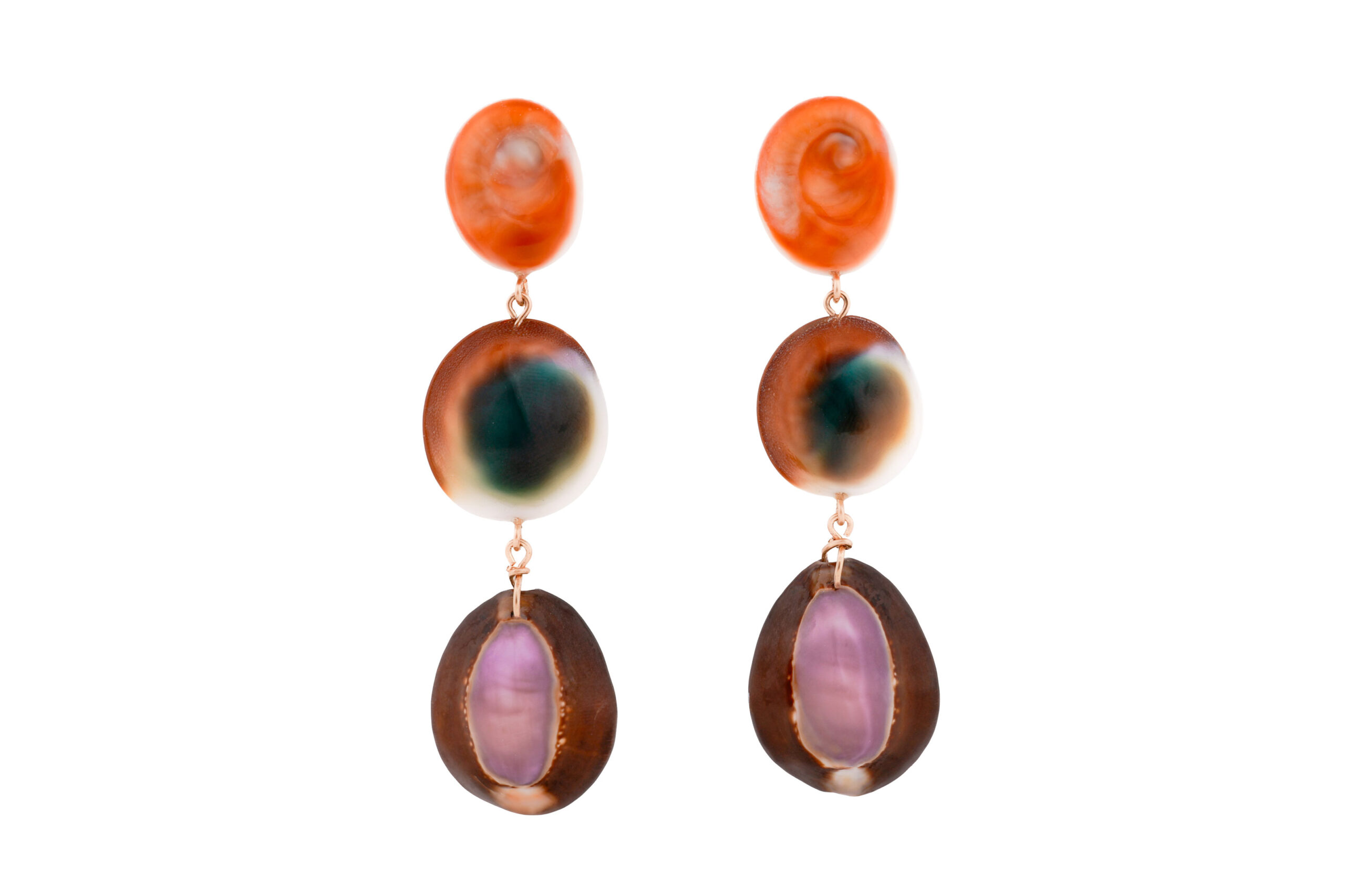 A sculptural pair of statement earrings crafted from three exceptionally rare seashells, arranged in a gentle vertical rhythm, with sizes gradually increasing as they fall.
