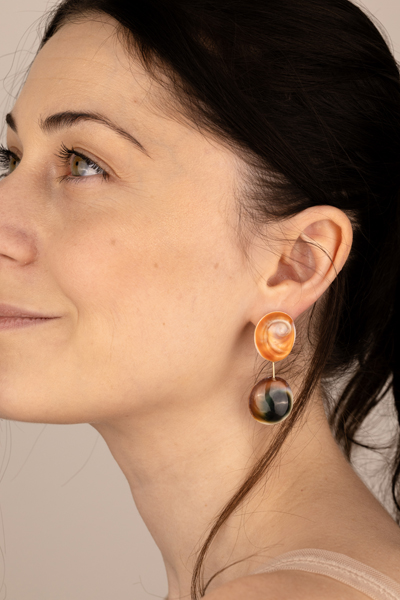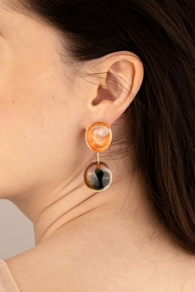 The organic, ear-like orange shell sits delicately at the stud, followed by an eye-shaped shell that catches the light with subtle intensity. Together, they create a quiet symbolism — listening and seeing — held close to the face.